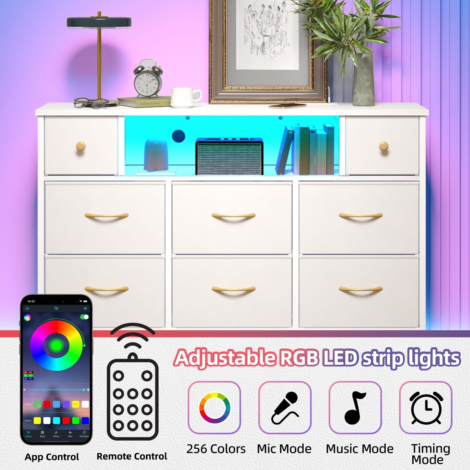 Fairy Dresser for Bedroom with 8 Drawers, White 55" TV Stand with Power Outlets and LED Lights, Fabric Chest of Drawers with PU Finish for Living Room, Entryway (White)