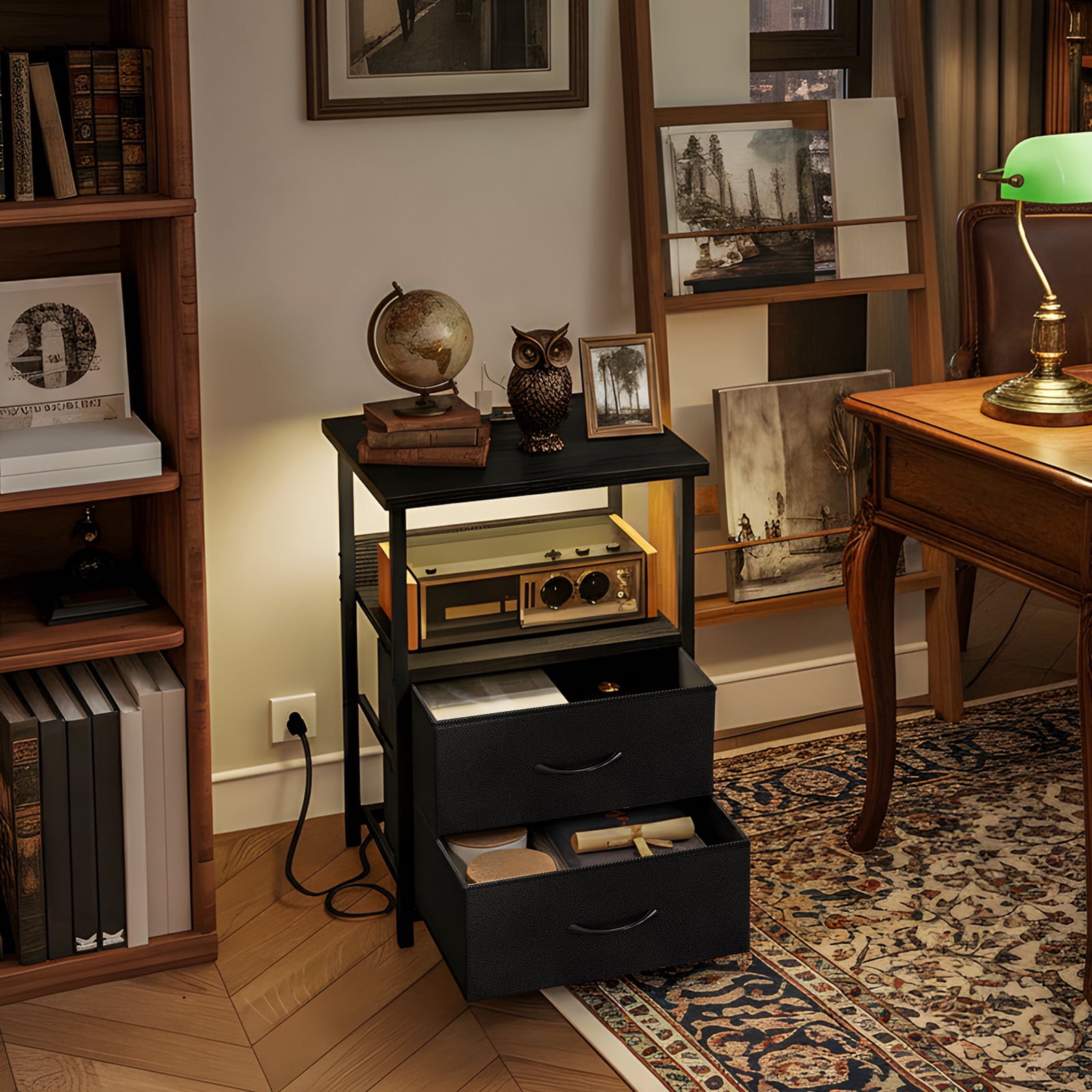 Fairy Night Stands Set of 2 with Charging Station, Bed Side Table, LED Nightstand with 2 Fabric Drawers, Black