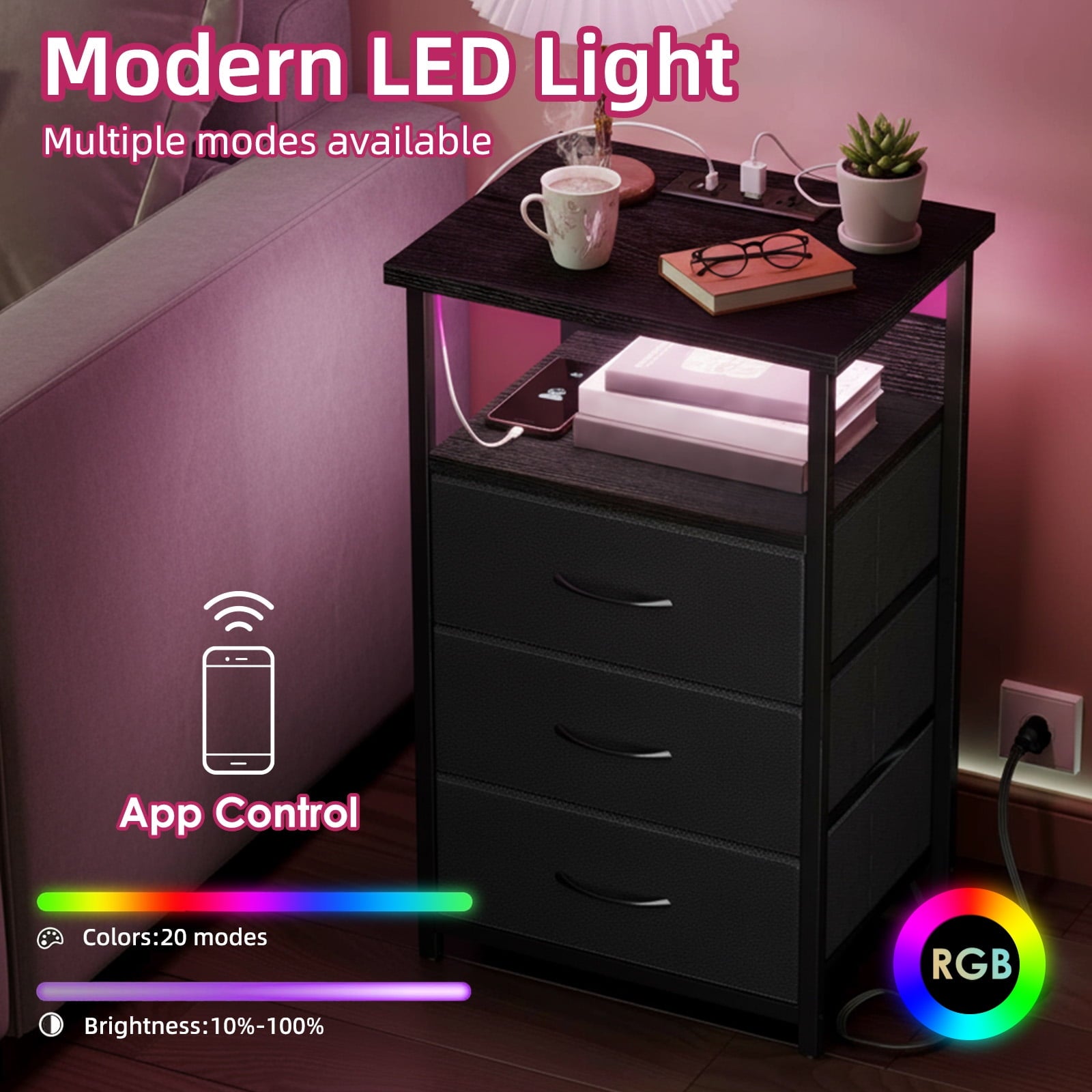 Fairy Night Stands Set of 2 with Charging Station, Bed Side Table, LED Nightstand with 3 Fabric Drawers, Black