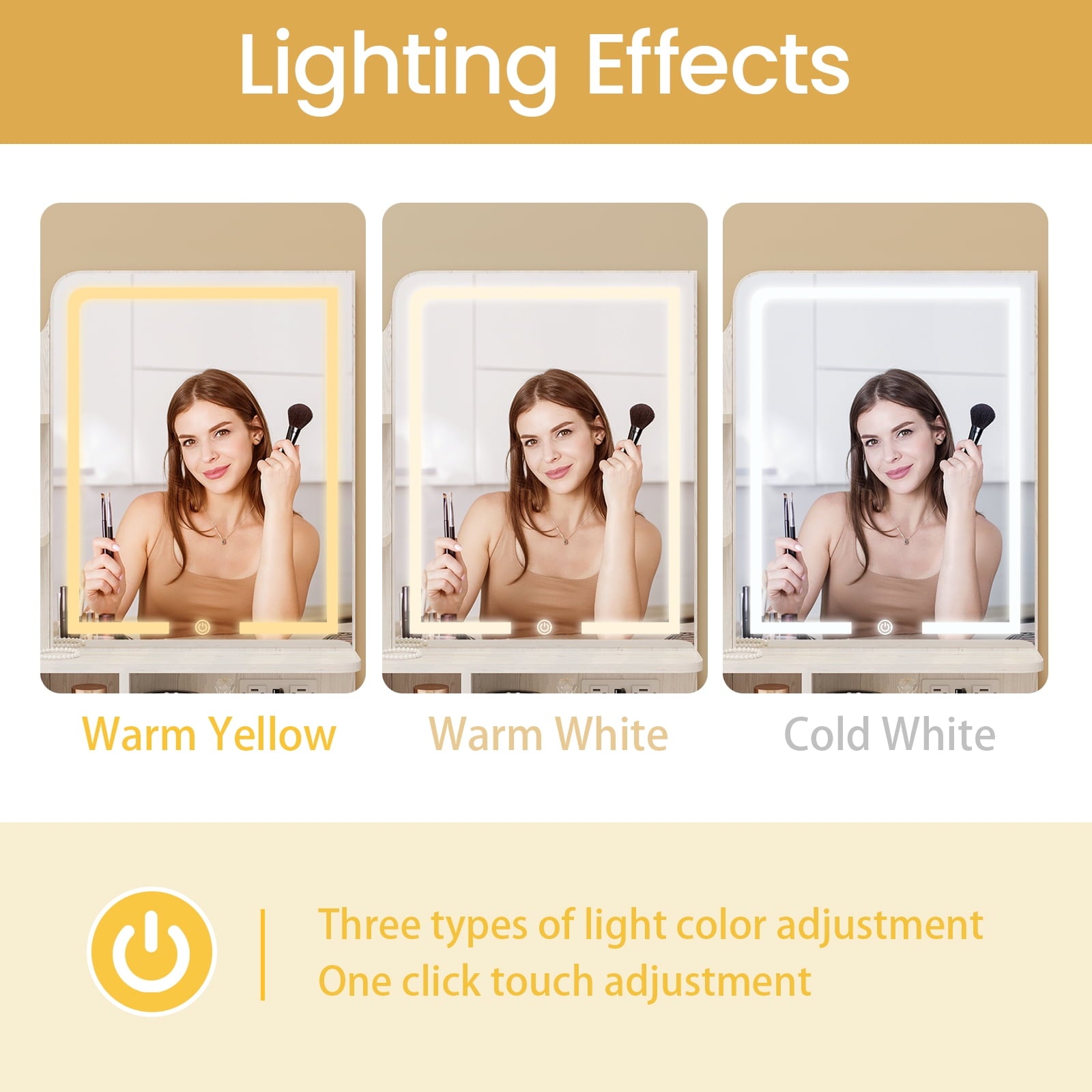 - LED Mirror with 3 Modes: Touch-control mirror offers warm, natural, and cool lights for any makeup need.