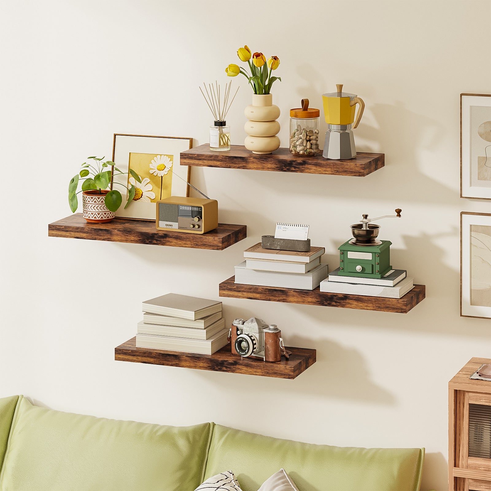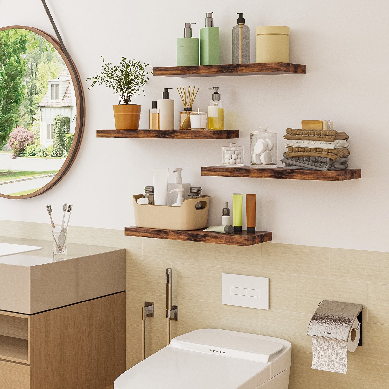 Tomnk 15.8" Floating Wall Shelves, Rustic Brown Wood Wall Shelf Set of 4, Invisible Brackets for Bathroom, Bedroom, Living Room, Kitchen