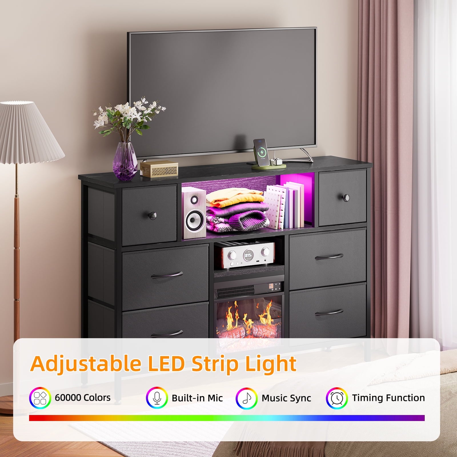 Bring style, warmth, and organization to your living room with this all-in-one TV stand! Perfectly sized to hold up to a 50-inch TV, this versatile piece features a built-in 14-inch electric fireplace that you can control with the included remote, offering 5 flame brightness and speed settings for customizable comfort. Stay connected with a built-in charging station that includes 2 AC outlets, 2 USB ports, and a Type-C port. The multi-color adjustable LED lights set the perfect mood, while six smooth-gliding drawers provide ample storage for all your media accessories and living room essentials. This TV stand is the perfect combination of function and ambiance, creating a cozy and inviting focal point for your home all year round.