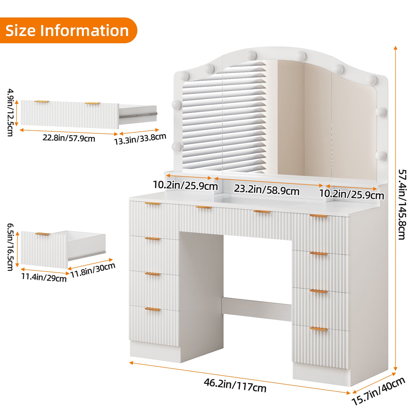 - Fluted Vanity Desk Drawers: Fluted panel and wide metal handle design are unique and elegant, enhancing the texture and presence of this exceptional piece. With 1 large drawer and 8 spacious drawers, this illuminated vanity desk offers plenty of storage space to keep your vanity tidy and organized.