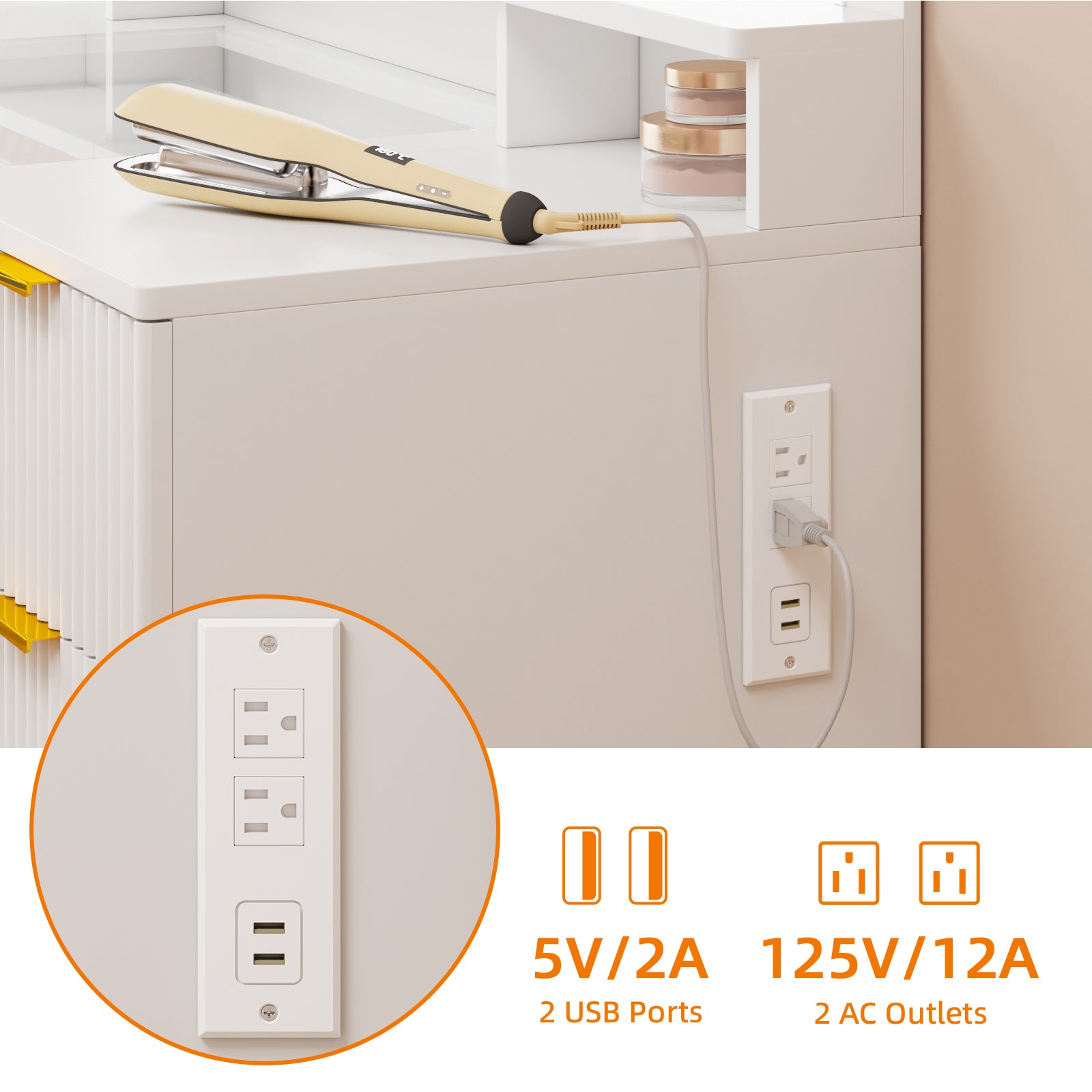 - Large Vanity Desk with Mirror: The standout feature of this makeup vanity desk is its 41.5"L x 21.5"W HD mirror, equipped with Hollywood-style bulbs. It offers 3 adjustable colors and brightness adjustable to ensure perfect makeup application. By pressing a button, you can modify the lighting color and brightness to suit various settings and makeup requirements.
