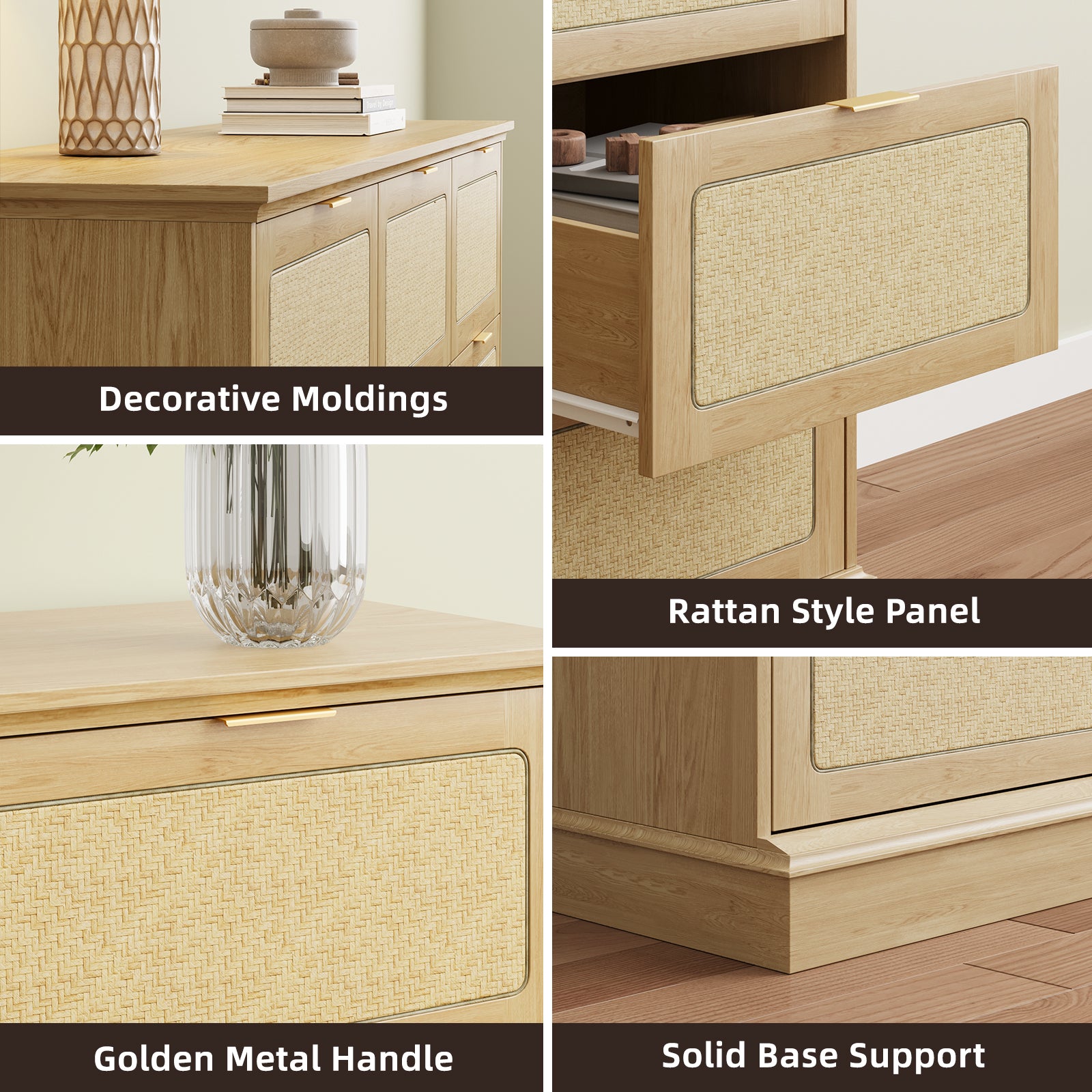 - Boho Rattan Dresser – Infuse your space with boho charm through artfully woven rattan panels and classic detailing. The natural rattan texture pairs beautifully with a solid wood frame, decorative moldings, and antique gold handles for a timeless aesthetic that complements any interior.