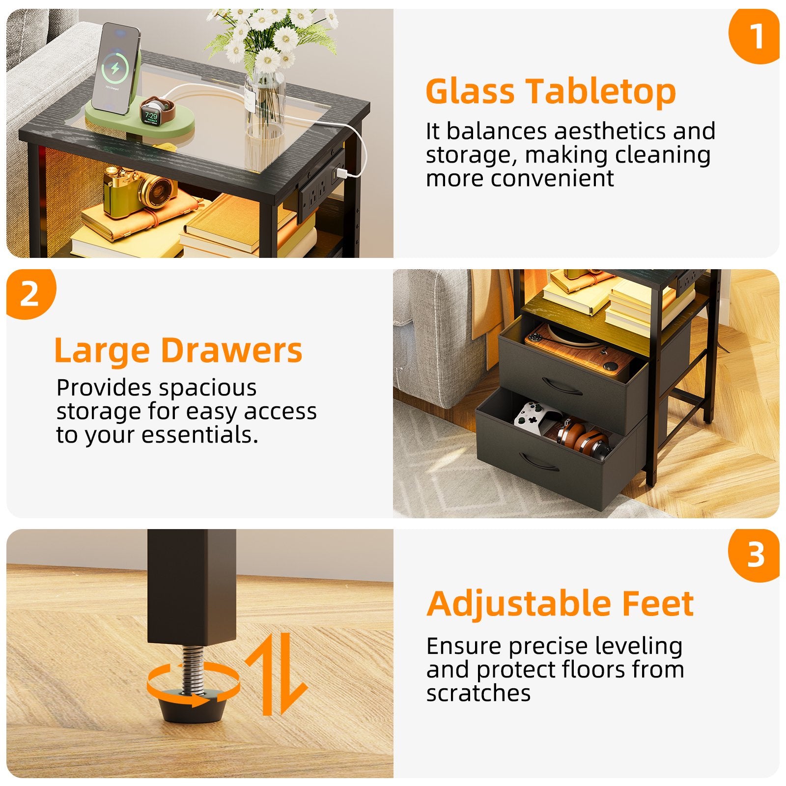 - 【Modern Glass Top & Practical Fabric Drawersl】 The upgraded tempered glass top not only offers a sleek, modern look but is also durable and practical, with a 30 lbs weight capacity. Two breathable fabric drawers provide discreet storage for everyday items, with each drawer capable of holding up to 12 lbs.