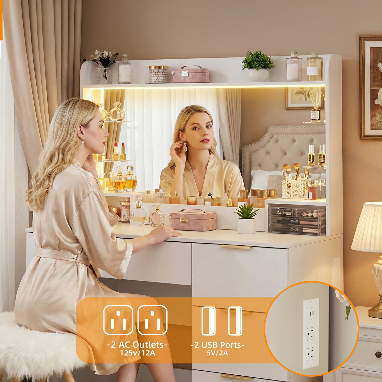 - 【Integrated Charging Hub for All Devices】 Stay powered up while you get ready. The vanity includes a built-in power strip with two AC outlets and two USB ports, allowing you to safely charge your phone, tablet, or plug in styling tools like hairdryers and straighteners—all within arm’s reach.