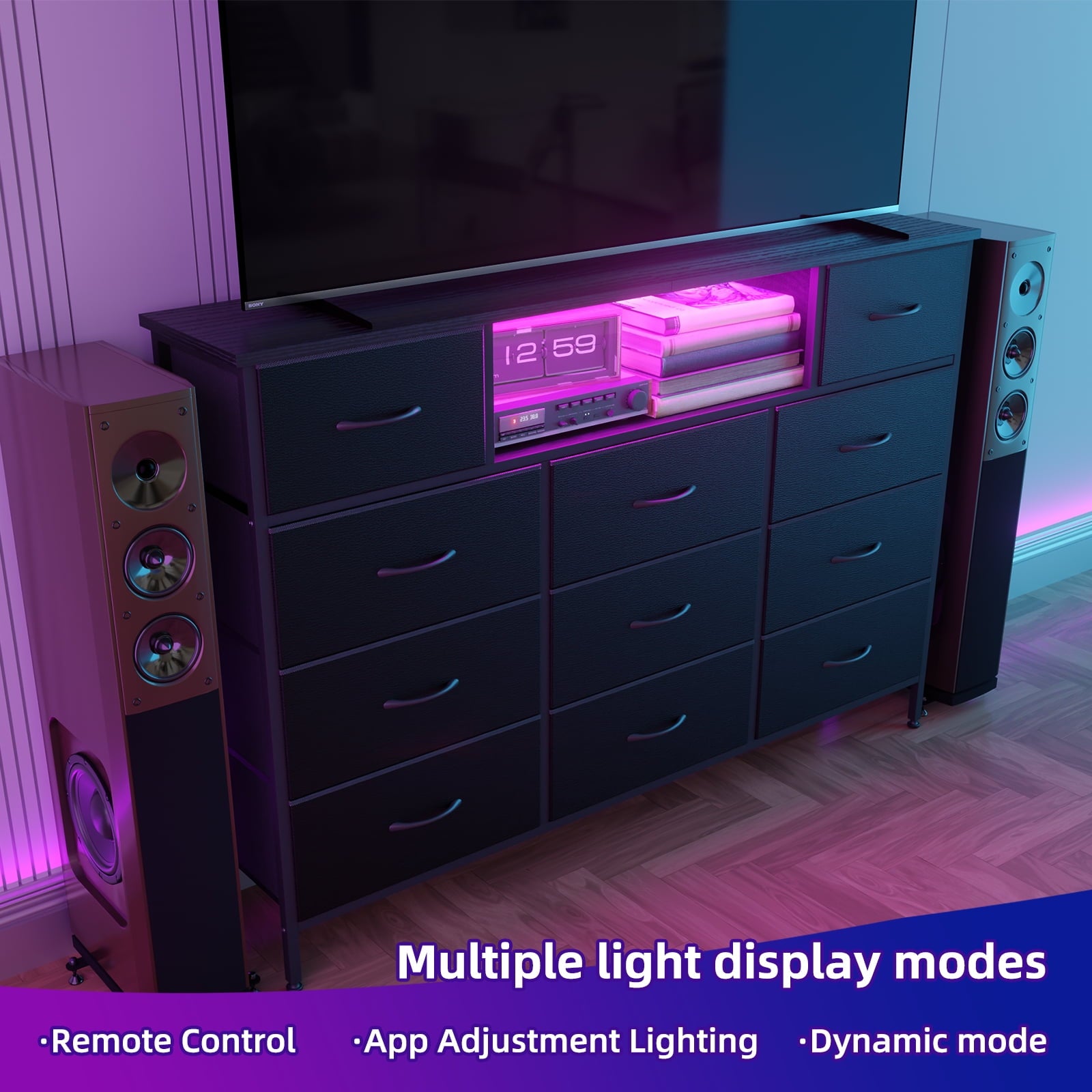 This smart charging dresser combines innovative technology with modern functionality, featuring a built-in charging station with 2 AC outlets and 2 USB ports for convenient device powering. Customize your room's ambiance through the dedicated app, which controls integrated LED lighting with adjustable colors, brightness, and dynamic modes. Its sleek, multi-functional design fits any space—bedroom, nursery, or living area—and supports TVs up to 65 inches as a sturdy media console. With 11 fabric drawers and compartments, it offers versatile storage for clothes, accessories, and more. Built with a durable metal frame, adjustable leveling feet, and wipeable, stain-resistant materials, this dresser ensures lasting stability and easy maintenance. Quick to assemble and designed for everyday use, it seamlessly blends smart features with practical organization.