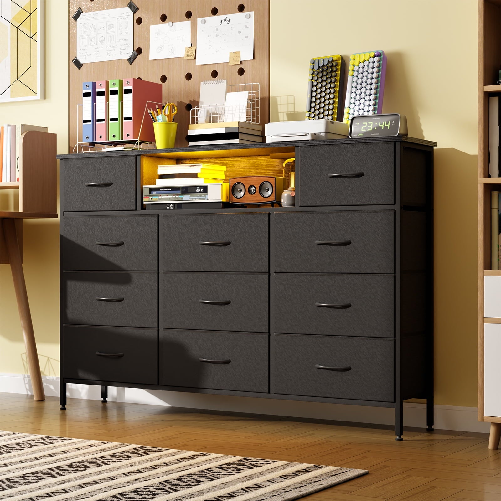 - 【Organized Storage with 11 Drawers】 With 11 fabric drawers and open compartments, this dresser offers flexible and well-organized space for clothes, accessories, toys, and more. Multiple drawer sizes help you categorize items neatly and access them with ease.