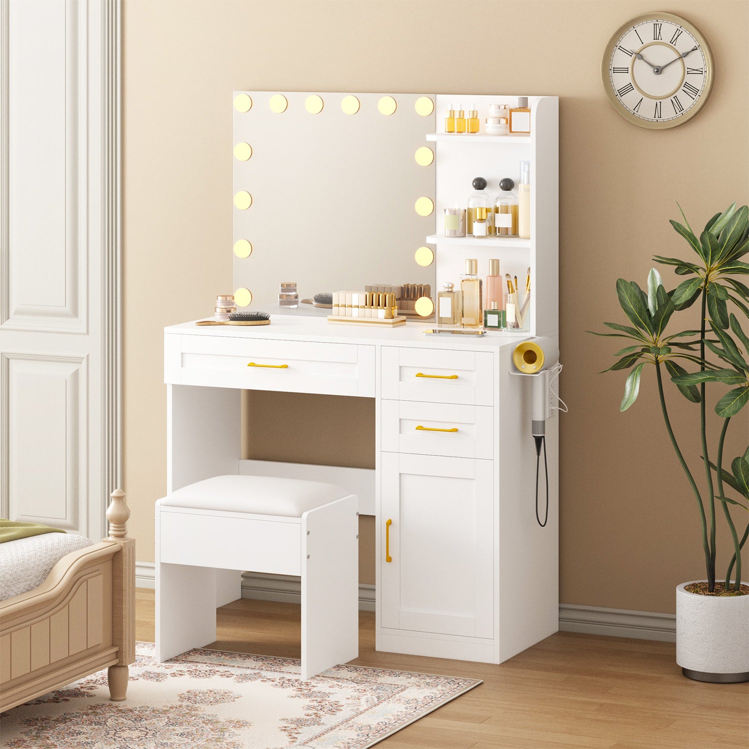 - Storage Capacity : white vanity desk with lights features 3-tier open storage shelves, 3 drawers and 1 large cabinet, hairdryer holder is available on the side.