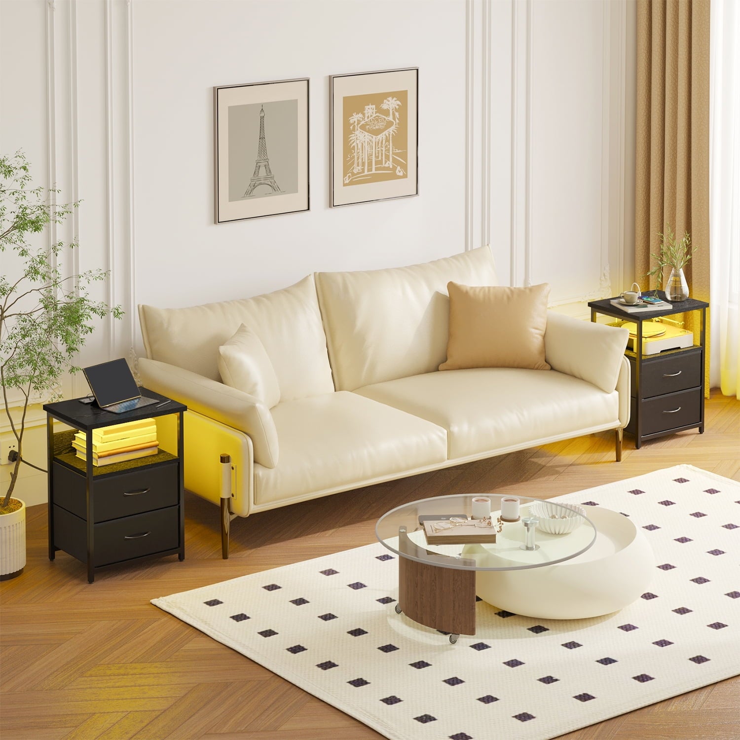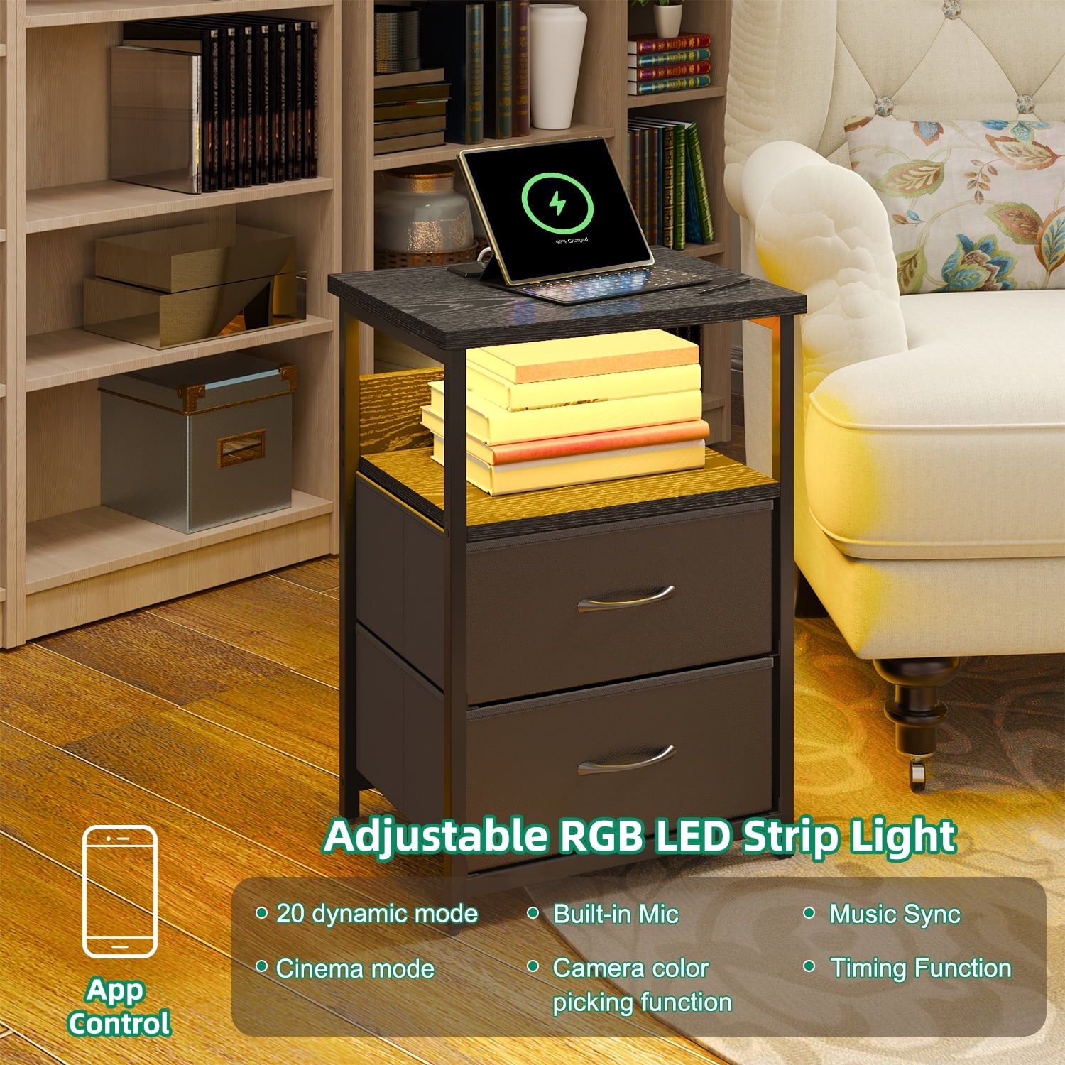 Transform your bedroom with this upgraded LED nightstand! Featuring adjustable RGB lighting strips controllable via an app, it offers multiple colors, brightness levels, and syncs to your music for a vibrant atmosphere. Equipped with 2 AC outlets and a 5 ft power supply cord, charging devices is effortless. The spacious design includes 2 large fabric drawers for organizing essentials, while the countertop provides space for lamps, books, and more. Built with durable materials and adjustable feet for stability, this nightstand is easy to install with clear instructions, allowing you to set up both in under 30 minutes.