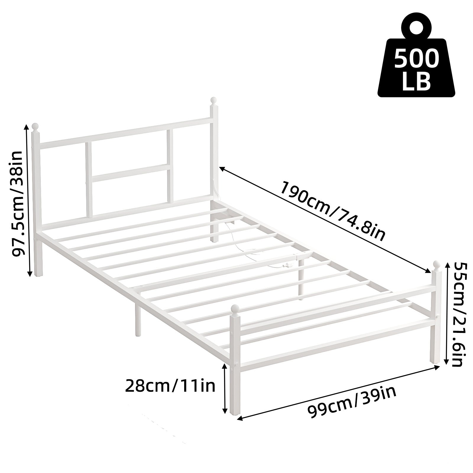 - Sturdy & Secure Design – Built for durability, this twin bed frame features a strong metal frame, a reinforced metal backrest, and built-in metal slats—no wooden slats needed. With a weight capacity of up to 500 lbs, it provides exceptional stability and support for a restful night’s sleep.
