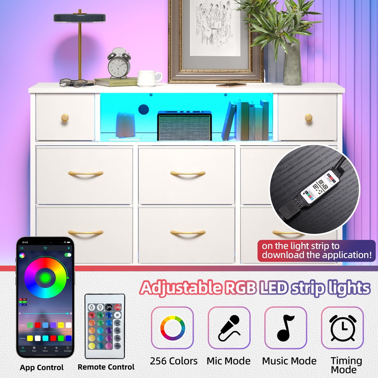 The Tomnk woo white dresser combines modern style with practical storage, serving as both a chest of drawers and a TV stand for TVs up to 55 inches. With six large and two medium drawers plus open shelves, it offers versatile organization for clothes, books, and other essentials. Built from durable MDF and a reinforced steel frame, it measures 47.2" x 11.8" x 31.5" and includes adjustable feet for added stability and floor protection. A built-in charging station (2AC+2USB) keeps electronics powered, while adjustable RGB LED lights create a warm, customizable atmosphere. Stylish and easy to maintain, it’s ideal for bedrooms, living rooms, or entryways.