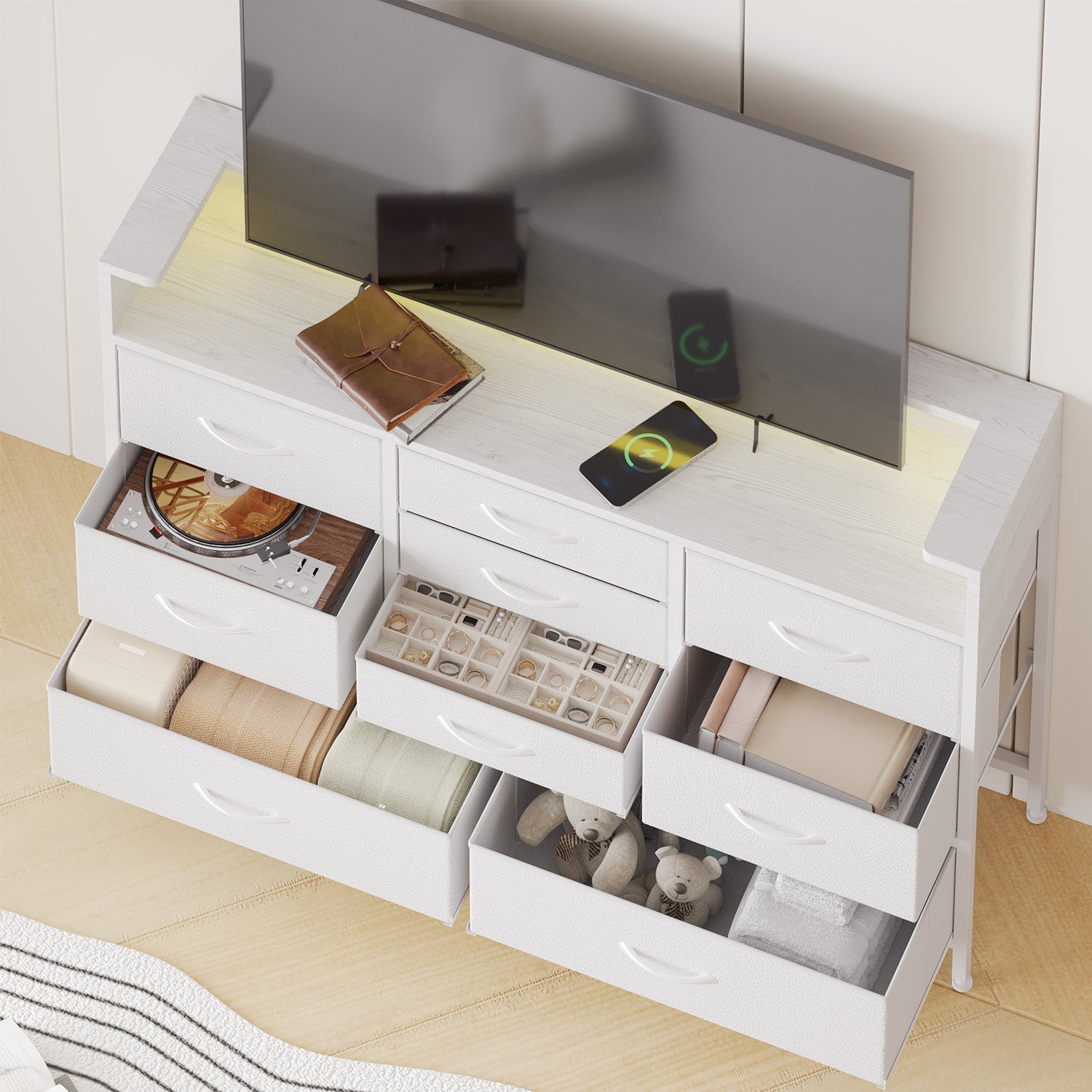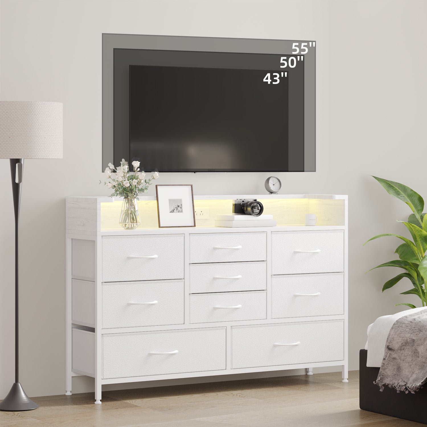 Tomnk woo White LED Dresser with 9 Drawers, Charging Station, PU Fabric Finish for Living Room, Hallway
