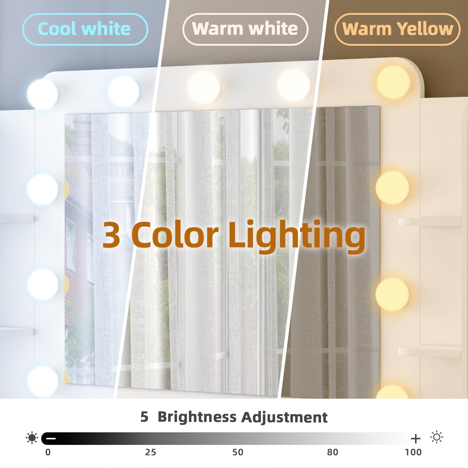 - Hollywood Mirror with 3 Light Modes: 11 bulbs with adjustable warm, natural, and cool lighting for perfect makeup.