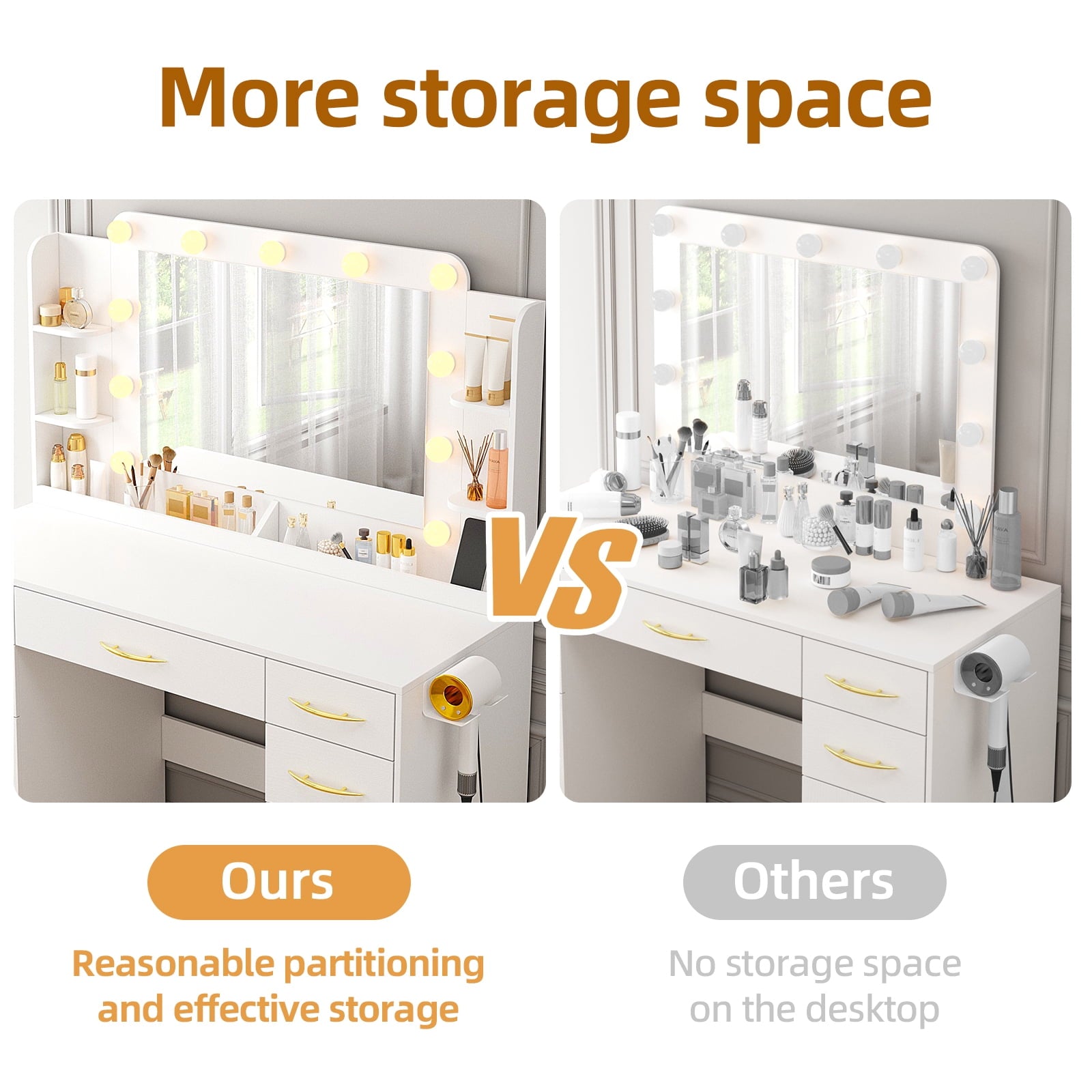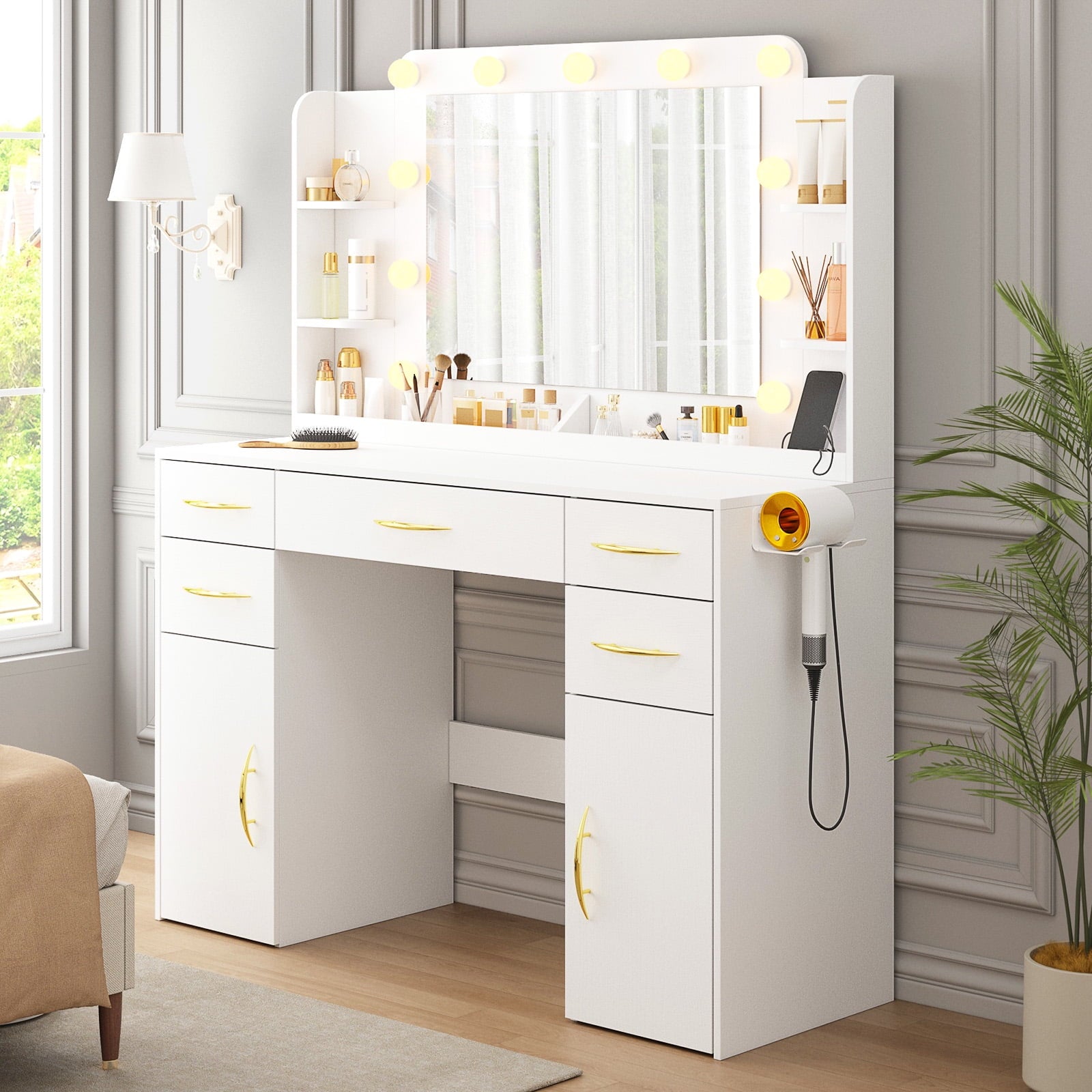Transform your bedroom with the Tomnk woo White Vanity Desk, combining elegant style and practical storage. This 45.5" vanity features a large mirror framed by 11 Hollywood-style lights with adjustable warm, natural, and cool modes for flawless makeup in any setting. With 5 drawers, 2 cabinets, side shelves, and built-in trays, it offers ample space to keep your beauty essentials neatly organized. The sleek white finish with gold handles adds a modern, sophisticated touch, making it a perfect fit for various décor styles. A built-in power outlet adds extra convenience for using hair tools or charging devices.