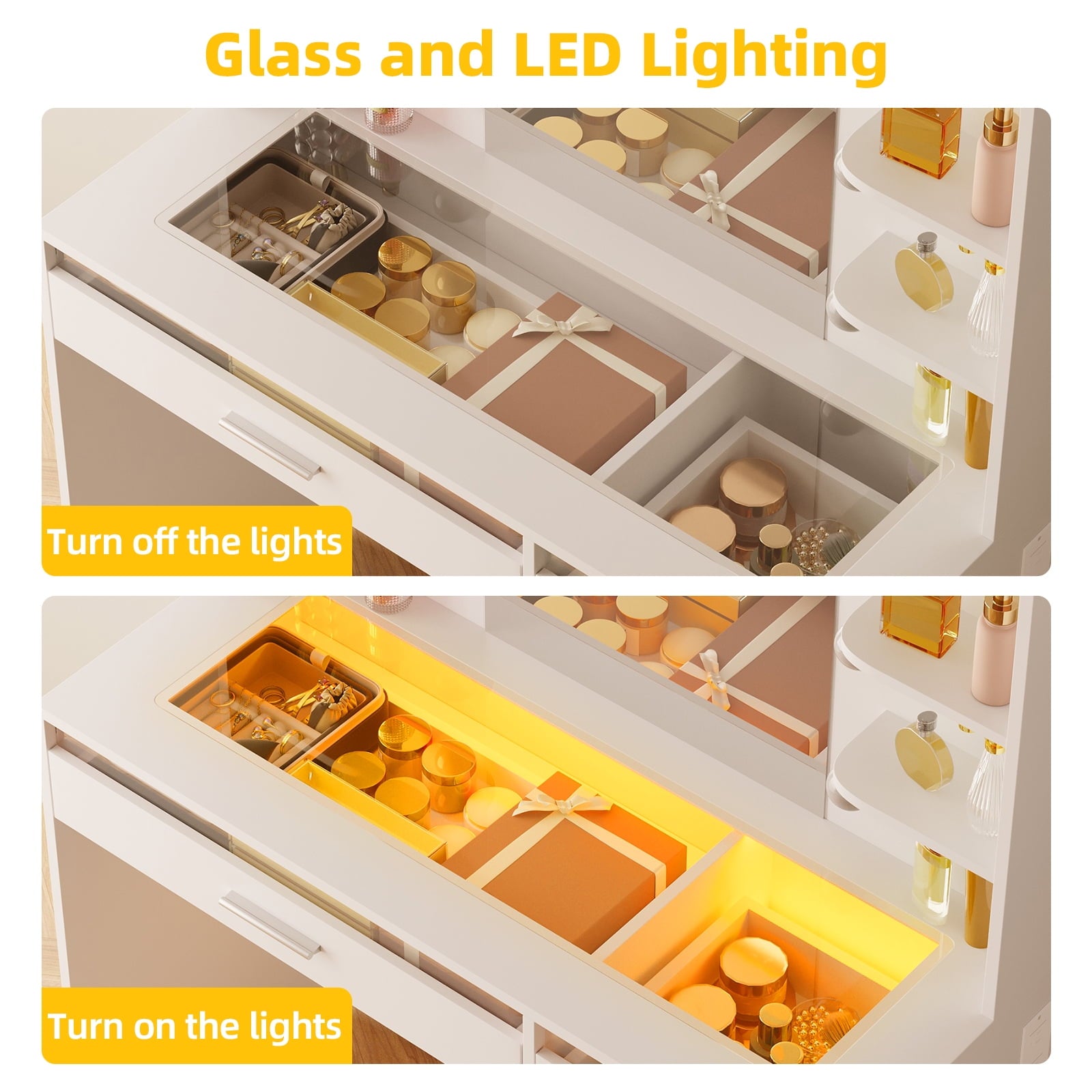 - 【Tempered Glass Tabletop】The vanity desk features a durable tempered glass surface with a clear, modern look. Its transparent design lets you easily see items stored in the drawers and adjustable shelves, adding both function and elegance to your room. Built-in LED lights with 5 color settings enhance the overall aesthetic.