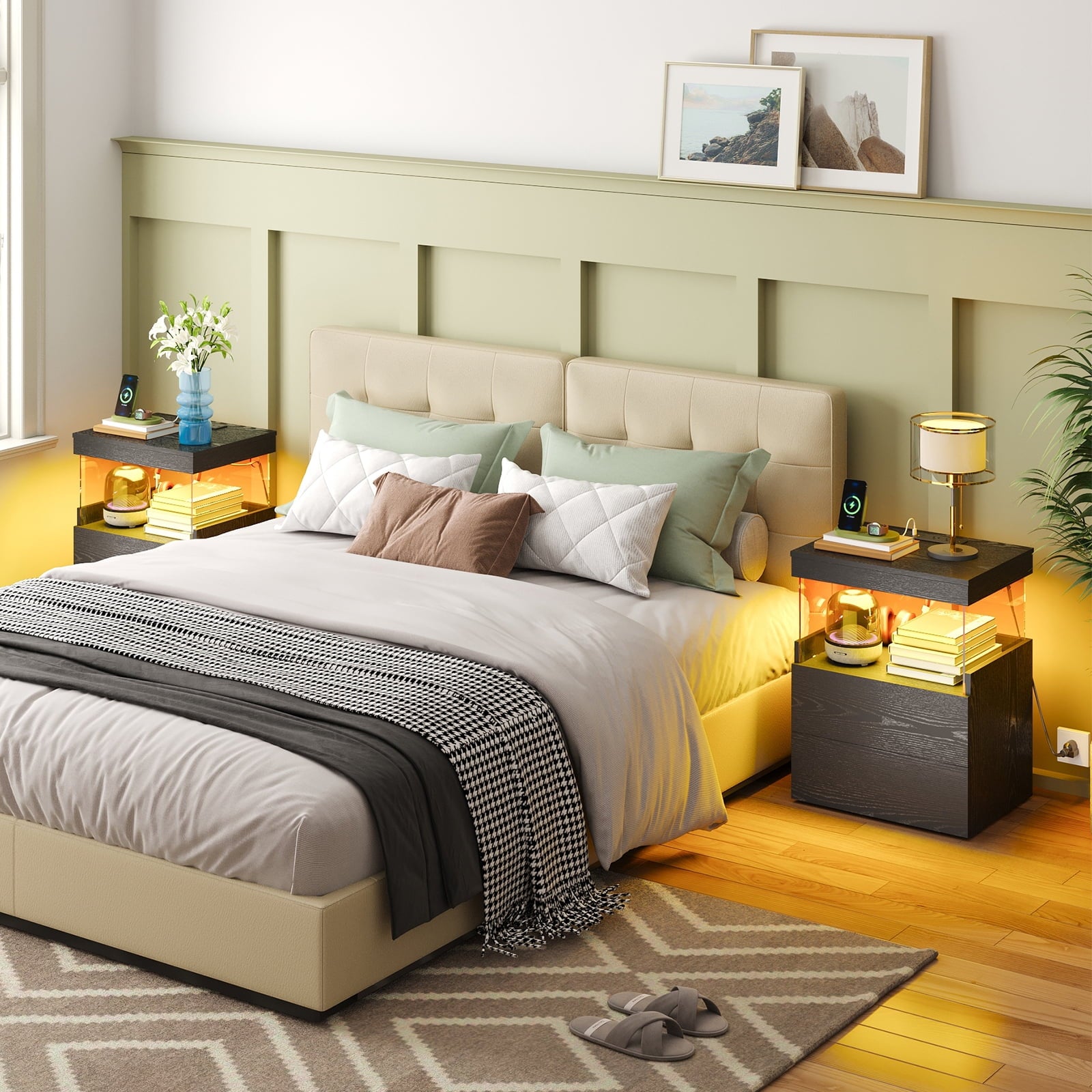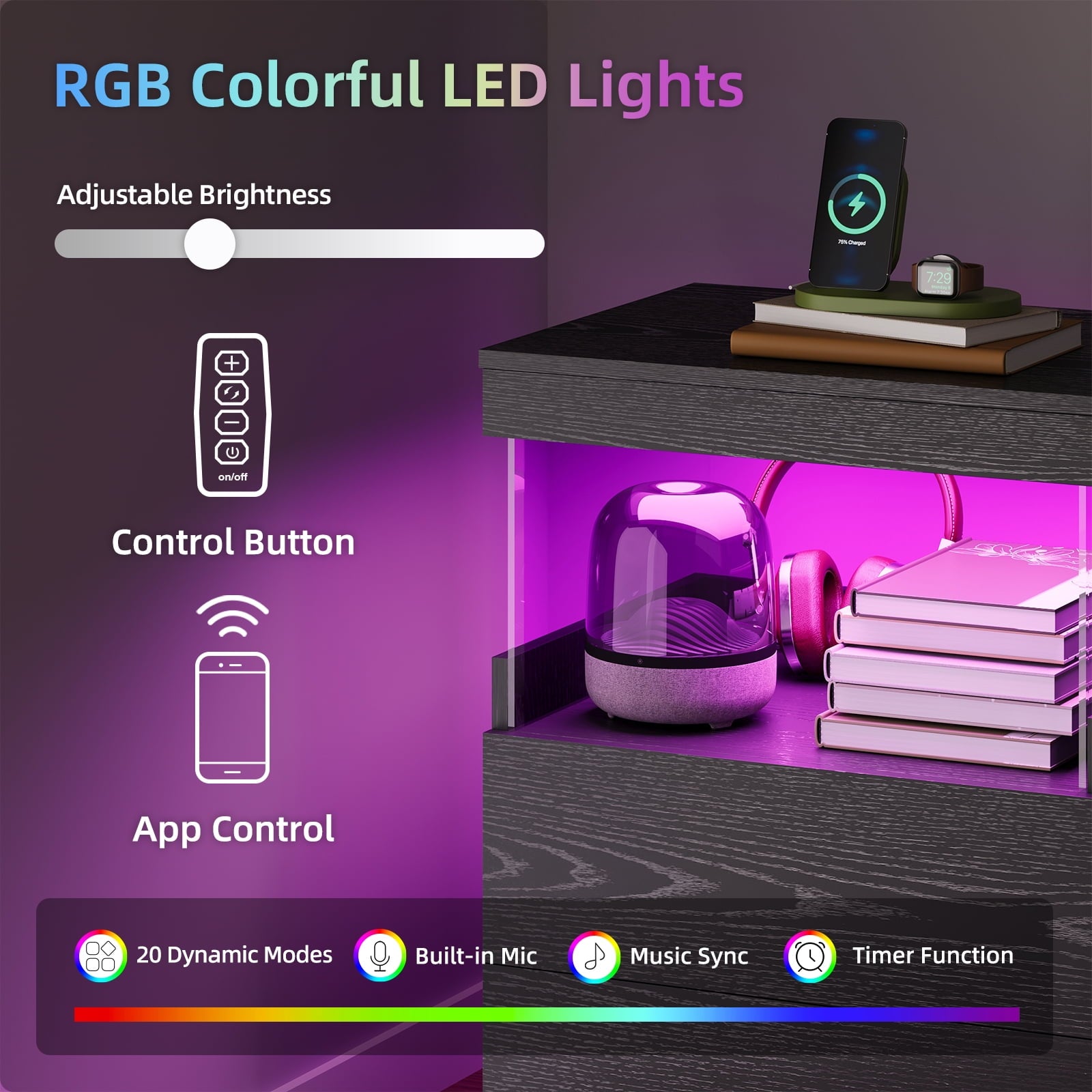 - 【LED Light with multi-variable RGB colors】: The color of the light strip is variable according to needs and scenes. The bedside nightstand comes with a beautiful Multi-colour RGB LED backlight. LED lights have 16 different multicolor modes to choose from, along with controlled brightness adjustment. The beautiful LED light will make your home looks more modern and fashionable.